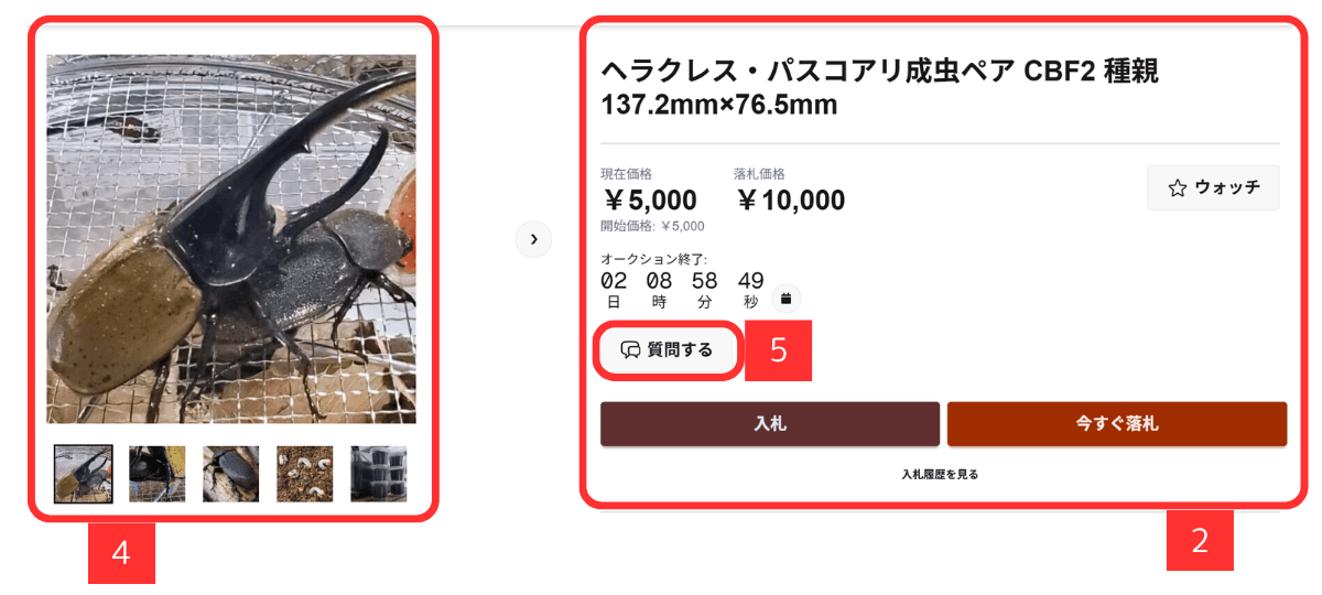 商品の状態、配送や梱包について、追加で注文したい場合など、入札前に出品者に質問することができます。気になることは必ず事前に確認しましょう。
