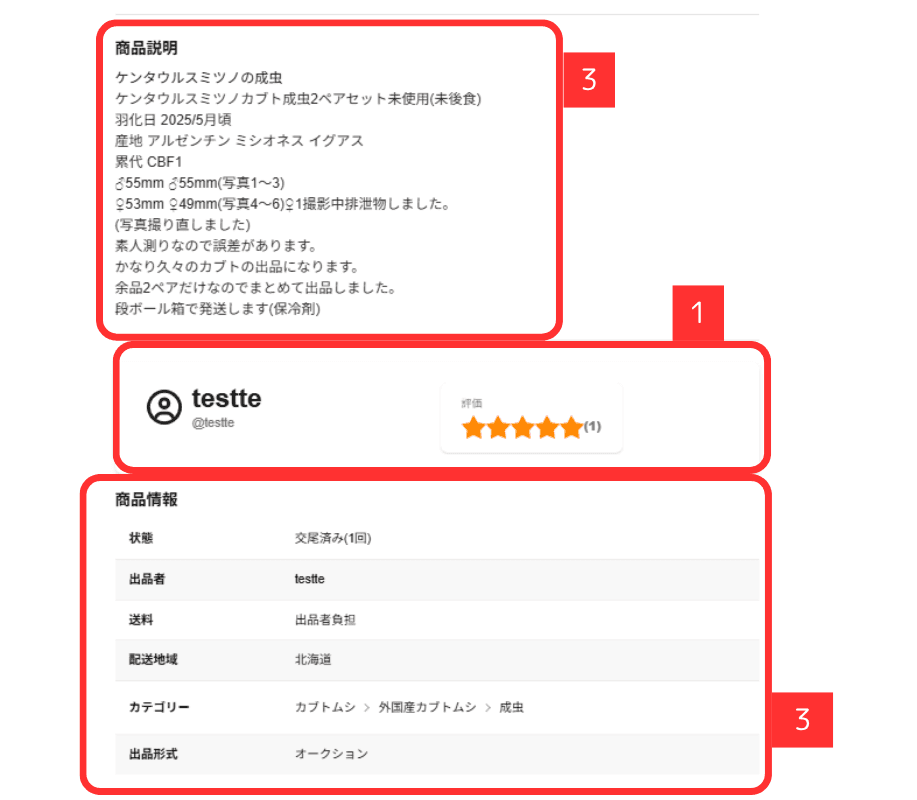 昆虫(生体)という性質上、孵化日や羽化日、跗節(フセツ)欠けやディンプル(小さな凹み)、使用・未使用の別、健康状態や産地など誤りがないかもしっかりと確認するようにしてください。※特に産地偽装や血統偽装にご注意ください。