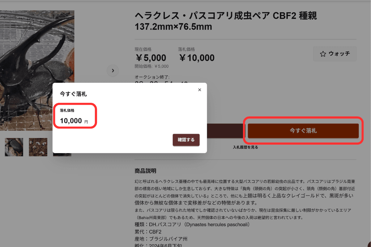 即決価格が設定されている場合、「今すぐ落札する」ボタンを押すとその場で商品を落札することができます。