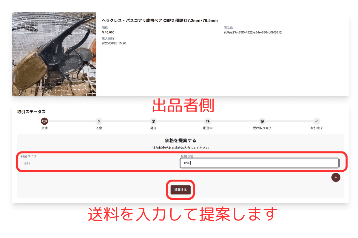 出品者から落札者に対して送料や追加の商品があるかなど、落札者に確認します。追加商品がある場合、取引ナビで項目を追加して金額を入力して代金を確定させます。落札されなかった場合