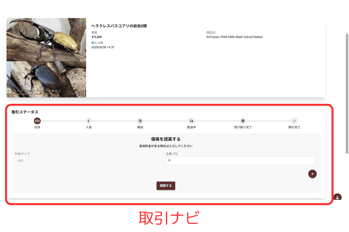 取引画面(取引ナビ)で落札者から提供してもらった、配送先情報を元に送料を調べて「送料」に追記して落札者へ価格を提案します。